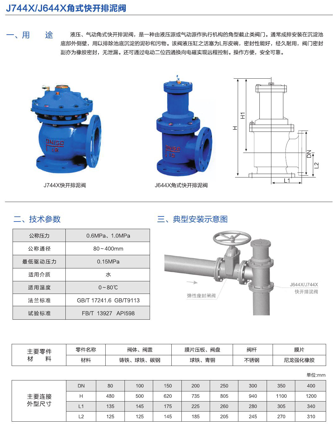 - 液壓、氣動角式快開排泥閥,是一種由液壓源或氣動源作執(zhí)行機構的角型截止類閥門。通常成排安裝在沉淀池底部外側壁,用以排除澉底沉淀的泥砂和污物。