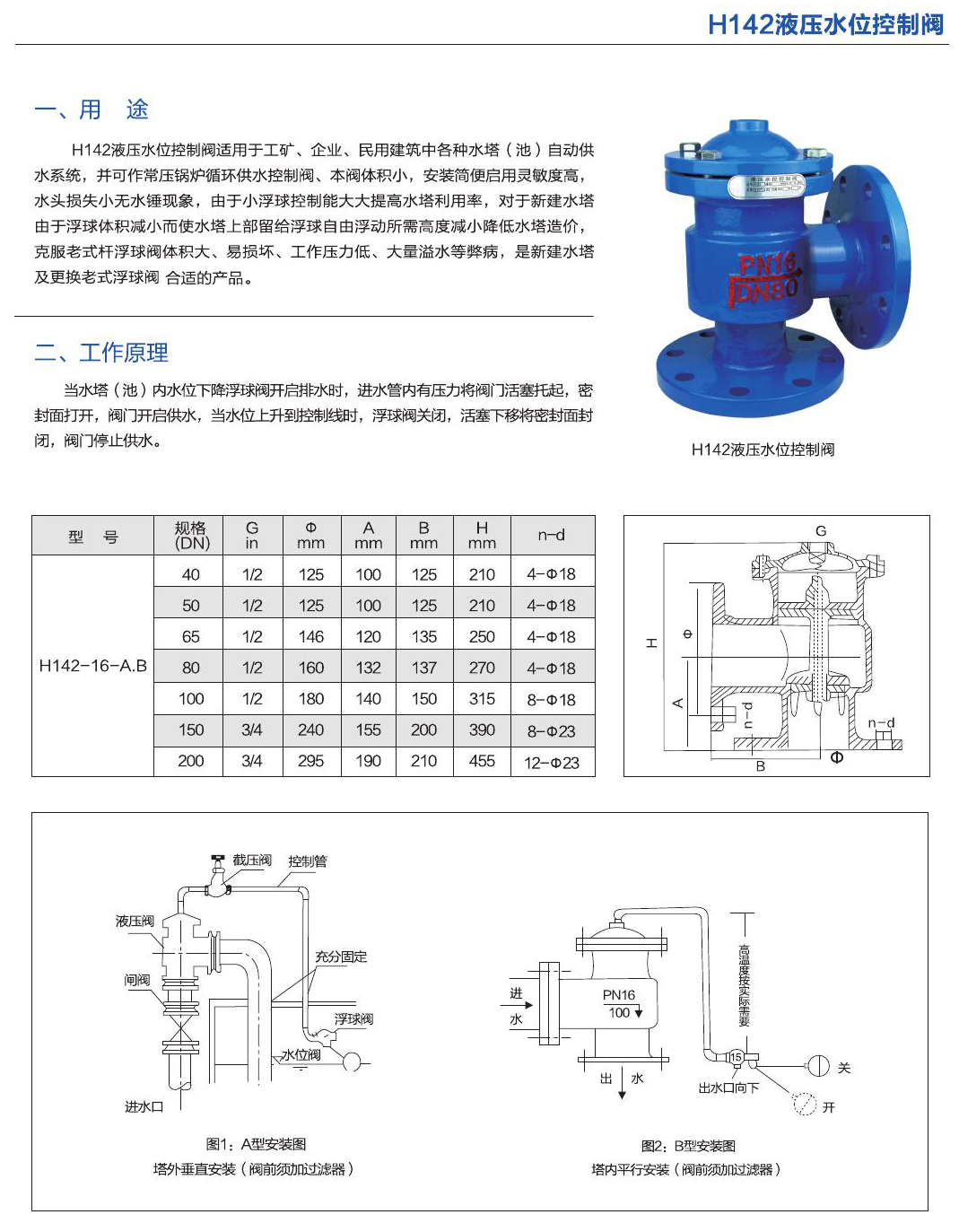 - H142液壓水位控制閥適用于工礦、企業(yè)、民用建筑中各種水塔(池)自動供水系統(tǒng),并可作常壓鍋爐循環(huán)供水控制區(qū)閥、體閥體積小,安裝簡便啟用靈敏度高,水頭損失小無水錘現(xiàn)象。