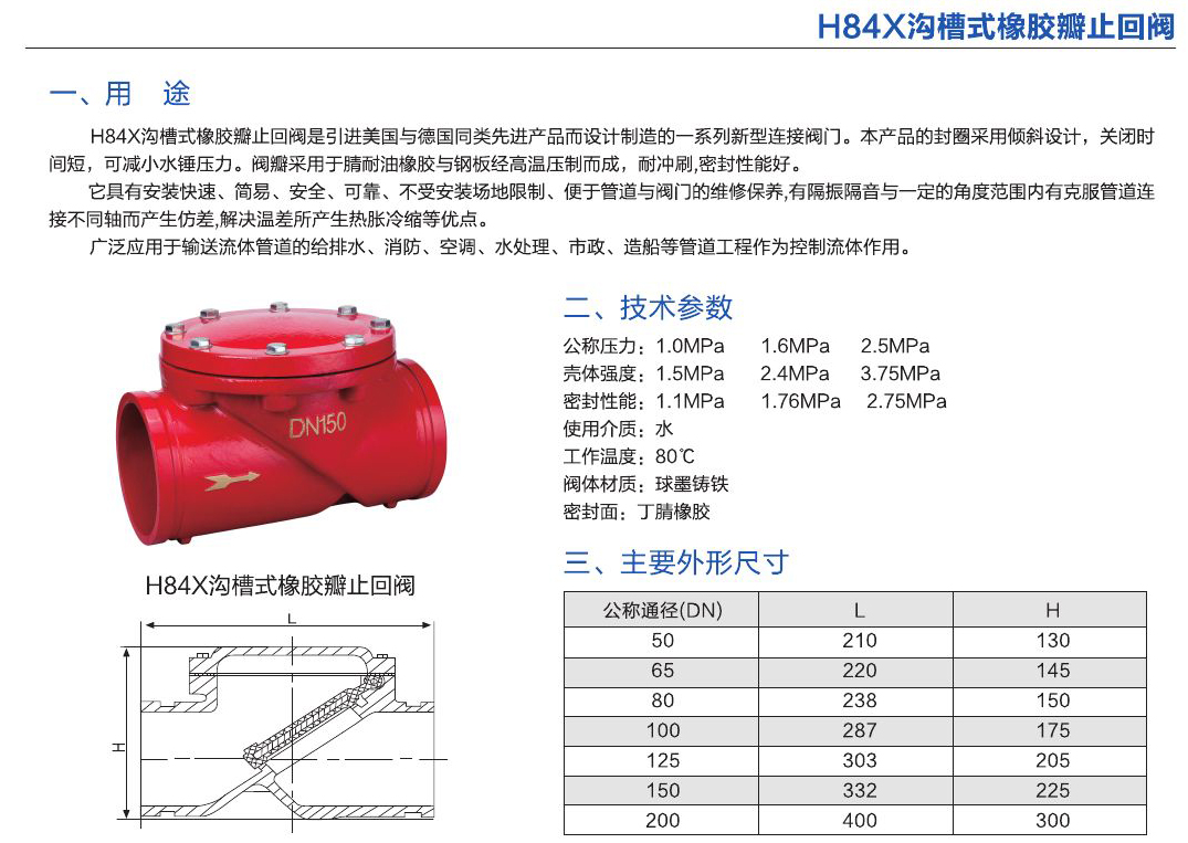 - H84X溝槽式橡膠瓣止回閥是引進(jìn)美國與德國同類先進(jìn)產(chǎn)品而設(shè)計制造的一系列新型連接閥門。本產(chǎn)品的封圈采用傾斜設(shè)計,關(guān)閉時間短,可減小水錘壓力。閥瓣采用于腈耐油橡膠與鋼板經(jīng)高溫國壓制而成,耐沖刷,密封性能好。