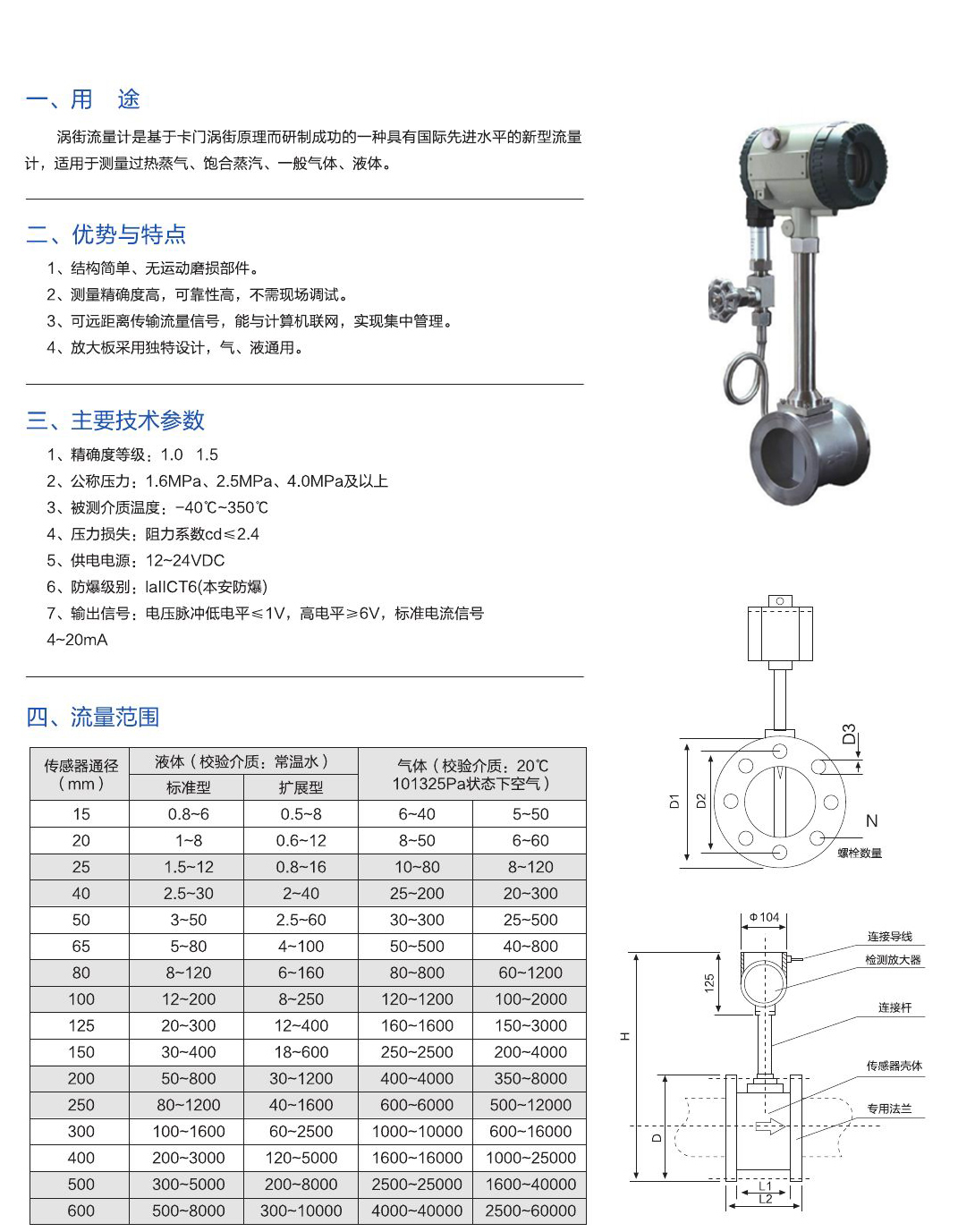 - 渦街流量計是基于卡門渦街原理而研制成功的一種具有國際先進(jìn)水平的新型流量計,適用于測量過熱蒸氣、飽合蒸汽、一般氣體、液體。