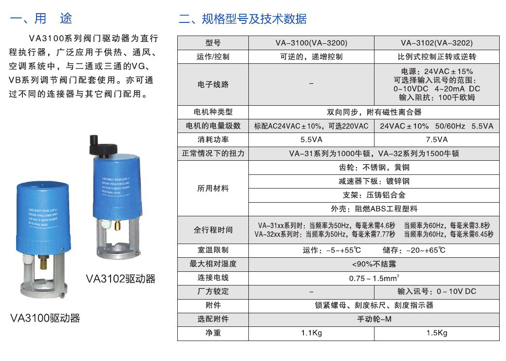 - VA3100系列閥門驅(qū)動(dòng)器為直行程掃行器,廣泛應(yīng)用于供熱、通風(fēng)、空調(diào)系統(tǒng)中,與二通或三通的VG、VB系列調(diào)節(jié)閥門配套使用。