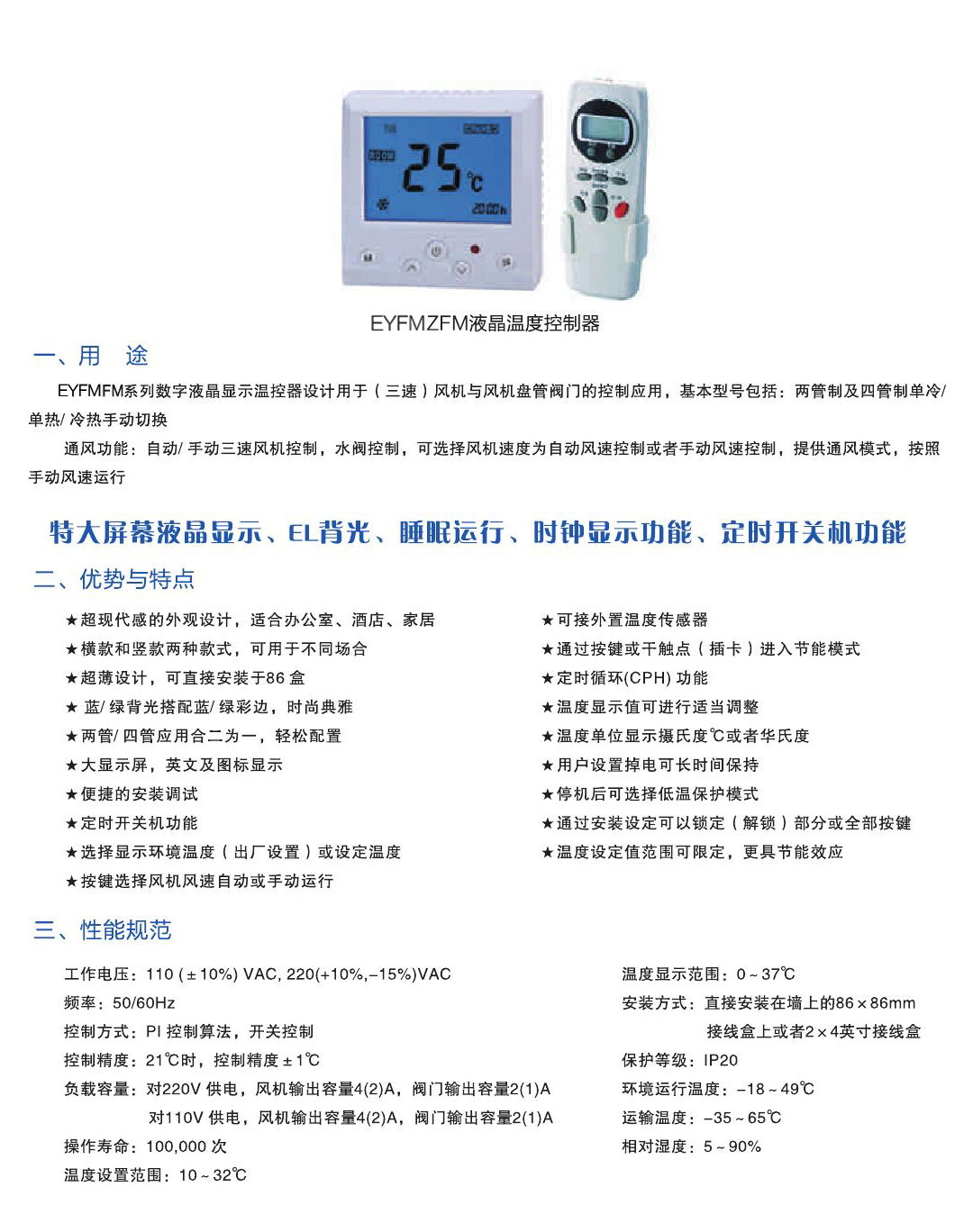- LGDZFM系列數(shù)字液晶顯示溫控器設計用于(三速)風機與風機盤管閥門的控制應用,基本型號包括:兩管制及四管制單冷/單熱/冷熱手動切換